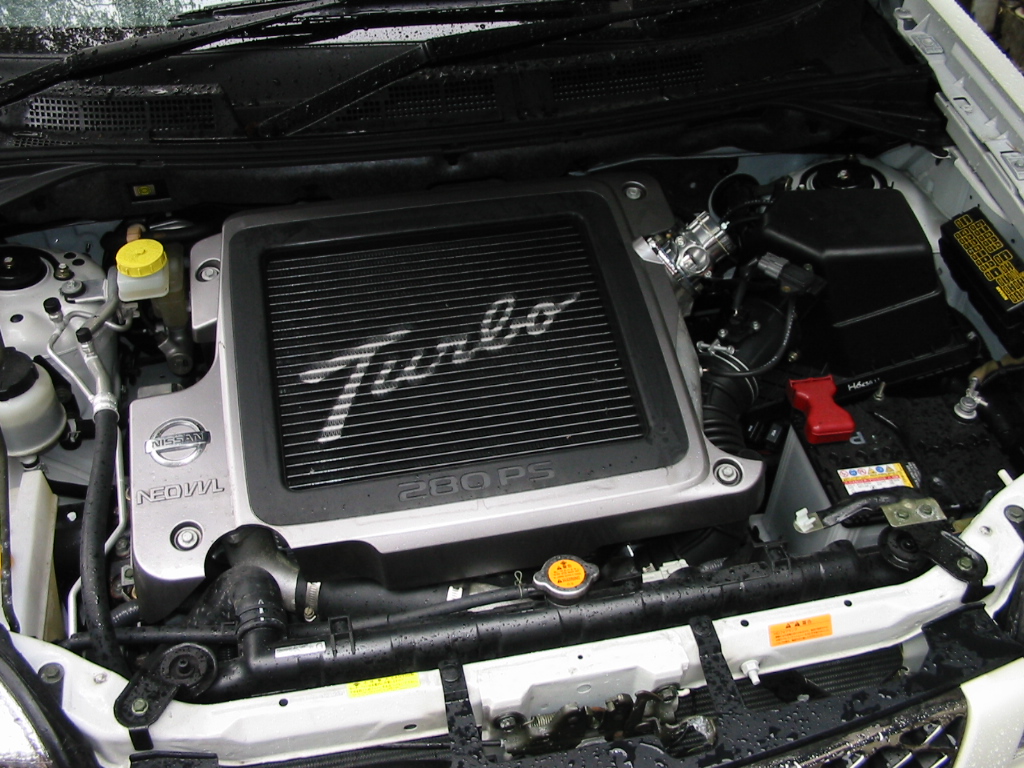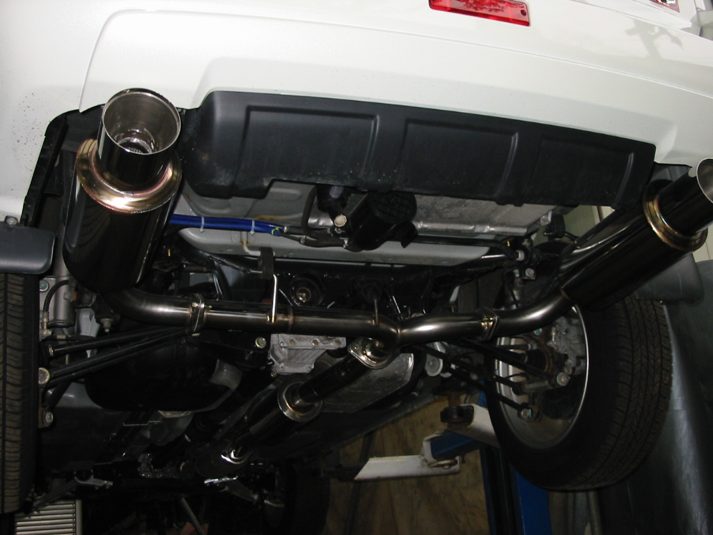 SR20VET搭載車両です 70Φオールステンレスセンターマフラーから60Φに振り分け左右砲弾型サイレンサーを付けて見ました。出口は、115Φです 迫力満点の後ろ姿です エンジンルーム写真は、ワンオフにてブリッツブローフをベースに取り付けて見ました(ブリッツには、X-TRAIL設定有りません)